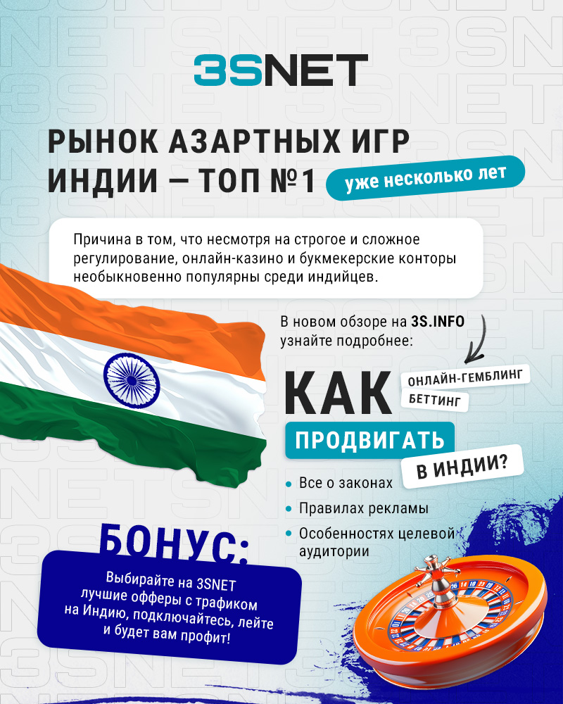 Рынок азартных игр Индии — топ №1 уже несколько лет. Причина в том, что несмотря на строгое и сложное регулирование, онлайн-казино и букмекерские конторы необыкновенно популярны среди индийцев. В новом обзоре на 3S.INFO узнайте подробнее “Как лить онлайн-беттинг и гемблинг в Индии?”: все о законах, правилах рекламы и особенностях целевой аудитории.