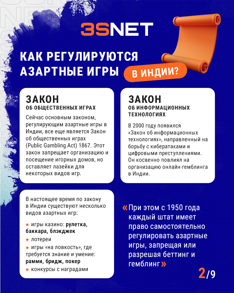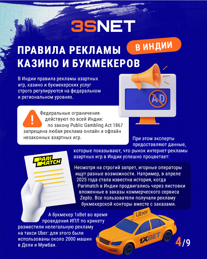 - Федеральные ограничения действуют по всей Индии: по закону, принятому в августе 2025, запрещена любая реклама онлайн и офлайн незаконных азартных игр.