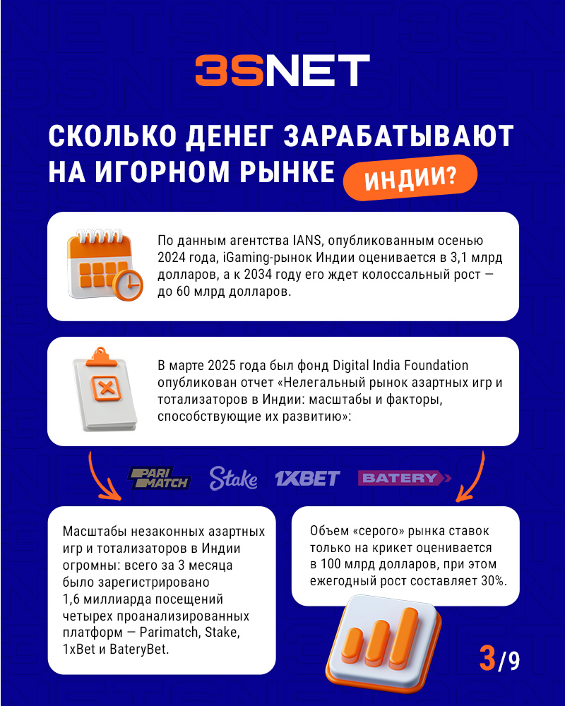 По данным агентства IANS, опубликованным осенью 2024 года, iGaming-рынок Индии оценивается в 3,1 млрд долларов, а к 2034 году его ждет колоссальный рост — до 60 млрд долларов.