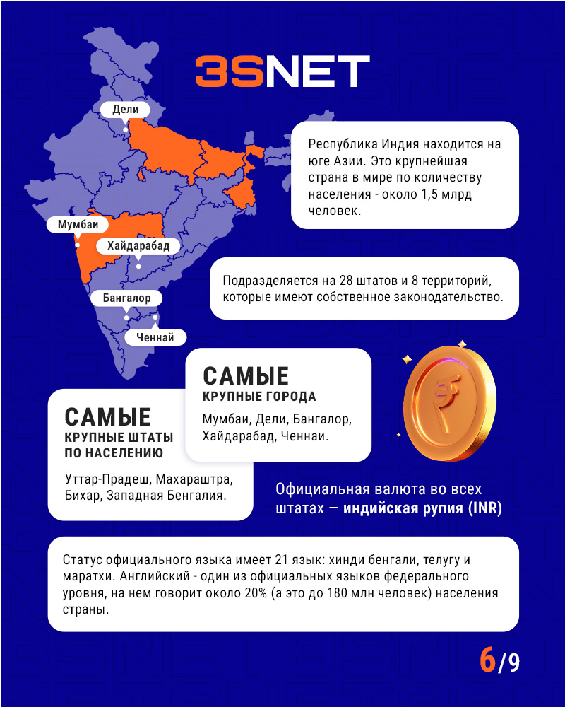 Республика Индия находится на юге Азии. Это крупнейшая страна в мире по количеству населения — около 1,5 млрд человек. Подразделяется на 28 штатов и 8 территорий, которые имеют собственное законодательство.