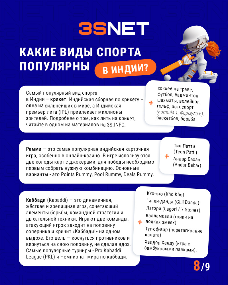 - Самый популярный вид спорта в Индии — крикет. Индийская сборная по крикету – одна из сильнейших в мире, а Индийская премьер-лига (IPL) привлекает миллионы зрителей. Подробнее о том, как лить на крикет, читайте в одном из материалов на 3S.INFO.
